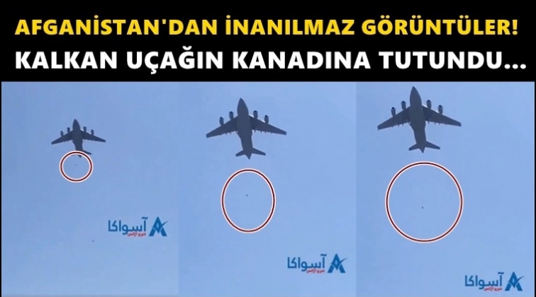 Afganistan'da yayın yapan Aswaka News'in yayınladığı görüntülerde Kabil Havalimanı'ndan kalkan uçağın iniş takımlarına tutunan iki kişinin uçaktan bir evin çatısına düştüğü iddia edildi.