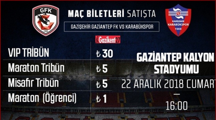 Spor Toto 1. Lig'in 17. haftasında 22 Aralık Cumartesi günü saat 16:00'da oynanacak Gazişehir Gaziantep - Karabükspor karşılaşmasının biletleri satışa sunuldu.