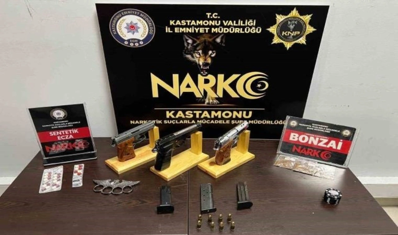 Aramada, 3 adet ruhsatsız tabanca ve bu tabancalara ait 8 adet fişek, 1 adet muşta, 14 adet sentetik ecza, 3 adet fişeklenmiş halde toplam 2,15 gram kannabinoid ve 1 adet esrar öğütücü ele geçirildi.
