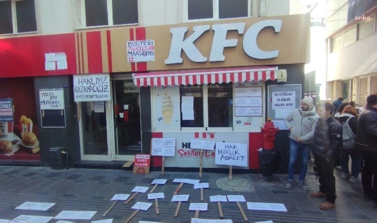 Maaş, tazminat, mesai, yıllık izin gibi haklarını alamayan işçilerin hak arayışı devam ederken İzmir’deki KFC ve Pizza Hut çalışanları, Karşıyaka Çarşı’da bulunan KFC şubesi önünde basın açıklaması ve eylem gerçekleştirdi.