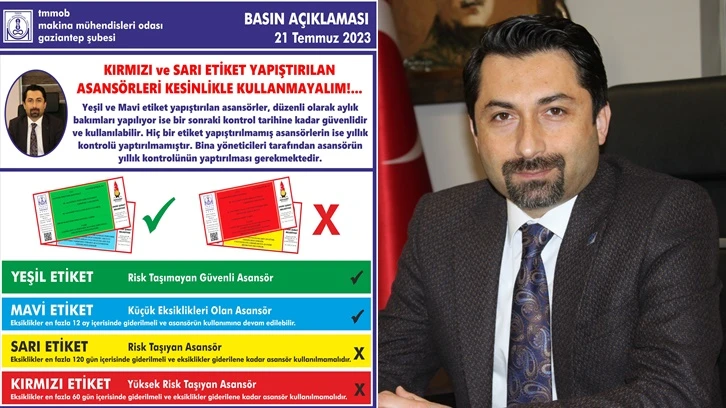 TMMOB Makina Mühendisleri Odası Gaziantep Şube Başkanı Aykut Kocalar, "Kırmızı ve sarı etiket yapıştırılan asansörleri kullanmayın!" çağrısında bulundu.