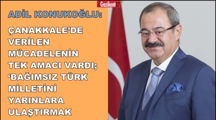 Gaziantep Sanayi Odası (GSO) Yönetim Kurulu Başkanı Adil Sani Konukoğlu 103 yıl önce her türlü yokluğa ve imkansızlığa rağmen Çanakkale’de verilen mücadelenin “Bağımsız Türk Milletini yarınlarla ulaştırmak” amacının bulunduğunu belirterek, “İşte bu yüce hedef sayesinde Çanakkale geçilmez oldu” dedi.