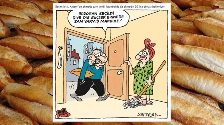 Karikatürde ekmek alıp evine dönene erkeğin eşine "Erdoğan seçildi diye dış güçler zam yapmış Makbule" dediği görülüyor.