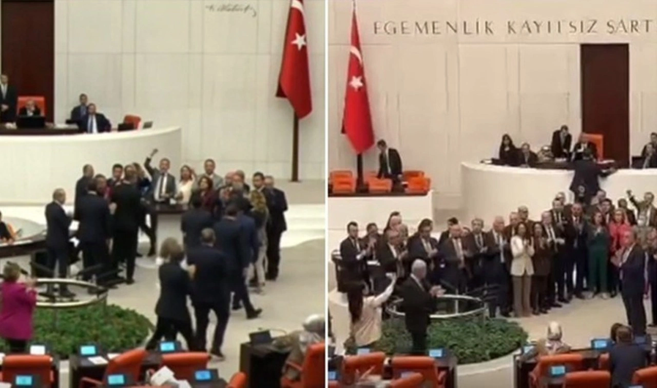 Genel Kurul'daki kürsünün etrafnıdan toplanan CHP'li miledtvekilleri alkışlarla kararı protesto etti.