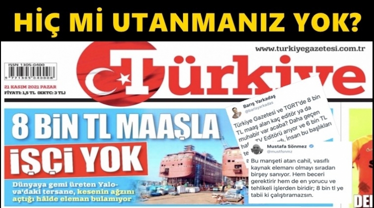 Gazeteci Barış Yarkadaş da "Türkiye gazetesi ve TGRT’de 8 bin TL maaş alan kaç editör ya da muhabir var acaba? Daha geçen hafta TV Editörü arıyor ve 6 bin TL teklif ediyorlardı. İnsan bu başlıkları atarken utanır" ifadesini kullandı.