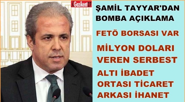 AK Parti Gaziantep milletvekili Şamil Tayyar’dan yargıya şok bir suçlama geldi. Tayyar, birçok yerde, işadamlarının ‘itirafçı’ denilerek tahliye edildiği FETÖ borsası kurulduğunu öne sürdü. Tayyar, bu borsada ‘milyon dolarların döndüğünü’ söyledi.