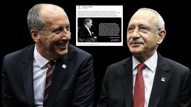 Bu paylaşımlarla güçlü adaylık sinyalleri veren Muharrem İnce, daha önce yaptığı açıklamalarda CHP lideri Kemal Kılıçdaroğlu ile müteaddit defalar karşı karşıya gelmeyeceğini söyledi.