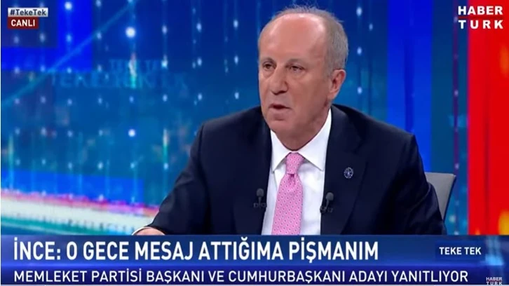Memleket Partisi Genel Başkanı ve Cumhurbaşkanı adayı Muharrem İnce, CHP ve İYİ Parti'ye ittifak çağrısında bulundu. 2018'deki Cumhurbaşkanlığı seçiminde CHP'nin kendisini 'korumadığı' suçlamasında bulunan İnce, 'Adam kazandı!' ifadesi için "O gece o mesajı attığım için pişmanım" ifadesini kullandı.