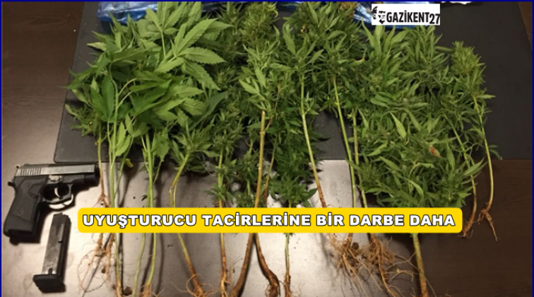 Gaziantep'te uyuşturucu operasyonunda 1 kilo 566 gram esrar maddesi, 33 kök hint keneviri ve 1 adet kurusıkı tabanca ele geçirildi.