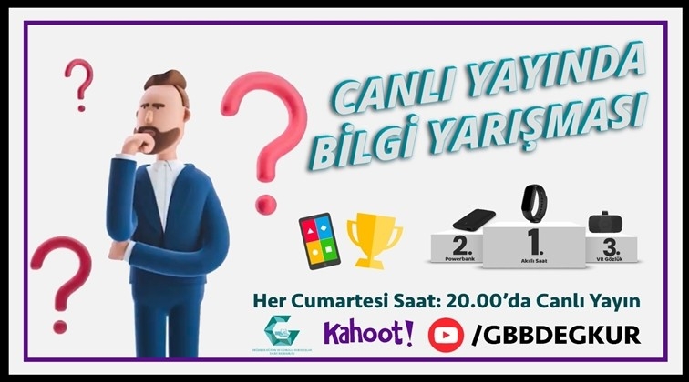 Gaziantep Büyükşehir Belediyesi Eğitim ve Gönüllü Kuruluşlar Daire Başkanlığınca online bilgi yarışması gerçekleştirilecek. Etkinliğe katılmak isteyen vatandaşlar, www.youtube.com/GBBDEGKUR kanalından yarışmayı canlı yayında izlerken kahoo.it sitesinden sorulara cevap verecek. Genel kültür konulu yarışma programı her cumartesi 20:00'da izleyicilere sunulacak. Sorulara doğru yanıtlar verip rakiplerini geride bırakacak ilk kişiye akıllı saat verilirken 2’nciye powerbank, 3’üncüye ise VR gözlük hediye edilecek.
