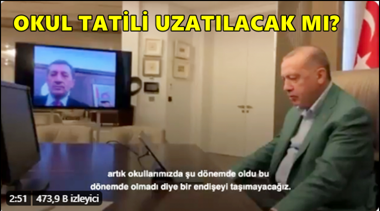 Cumhurbaşkanı Recep Tayyip Erdoğan Twitter hesabından paylaştığı mesajda "Milletimizin hizmetinde mesaimiz devam ediyor" ifadelerine yer verdi. İlgili bakanlarla görüntülü görüşme yapan Erdoğan, Milli Eğitim Bakanı Ziya Selçuk'un 'okulların tatilinin uzatılması yönünde talimatınız var mı?' sorusuna "Bu konuda Bilim Kurulu'nun tavsiyelerini dikkate alacağız. Bilim Kurulu uzatalım diyorsa ona uyalım. bir hafta yeter diyorlarsa ona uyalım. İşin ehli onlar." yanıtını verdi.