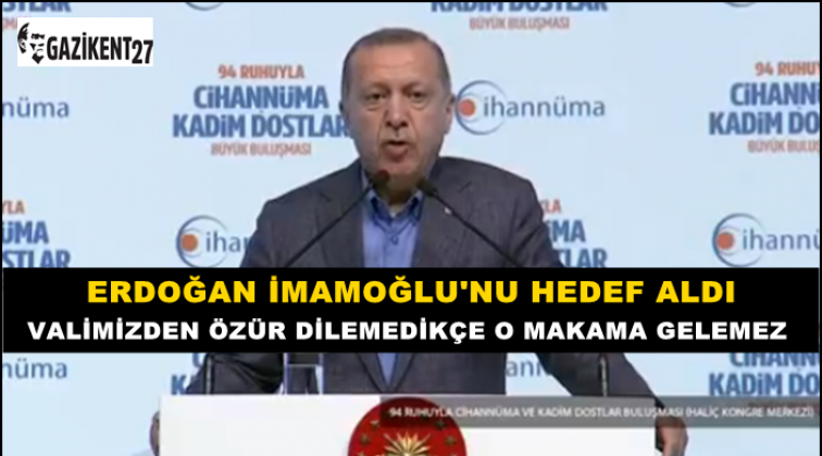 CHP İstanbul Büyükşehir Belediye Başkan Adayı Ekrem İmamoğlu'nun, Ordu-Giresun Havalimanı'nda VIP salonuna alınmaması üzerine yaşanan olayı anımsatan Erdoğan, "Ordu'da bu milletin, devletin valisine ne diyor, 'it' diyor. Bu nasıl kucaklama ya? Benim milletimden, başta Ordu Valimiz olmak üzere özür dilemedikçe böyle bir adaylığa bırakın layık olmak, böyle bir makama gelemez" diye konuştu.