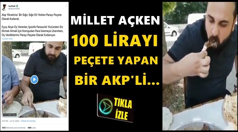 AKP yöneticisi olduğu ileri sürülen kişinin pirzola yerken parayı peçete olarak kullandığı görüntüler sosyal medyada büyük tepkiye neden oldu.