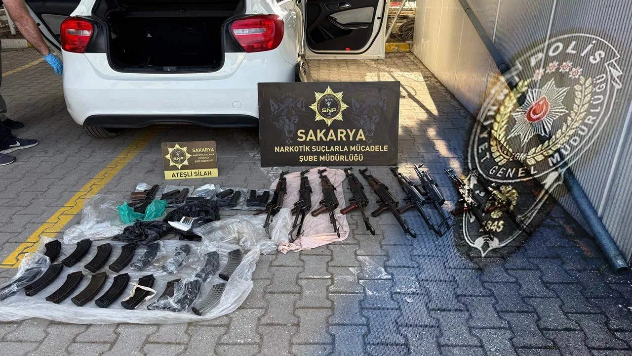 Araçta yapılan aramada, 9 kaleşnikof piyade tüfeği, 5 ruhsatsız tabanca ve bunlara ait 25 şarjör ile 77 fişek ele geçirildi.