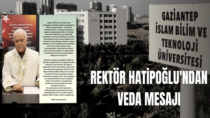Gaziantep İslam Bilim ve Teknoloji Üniversitesi’nde yeniliklere öncülük ederek ilkleri başaran kurucu Rektör Prof. Dr. Nihat Hatipoğlu, veda mesajı yayınladı. Gaziantep’te görev yaptığı 4 yıllık süre içerisinde desteklerinden dolayı Gazianteplilere teşekkür eden Hatipoğlu, GİBTÜ’yü daha da ileri taşımak için her zaman destek olmaya hazır olduğunu ifade etti.