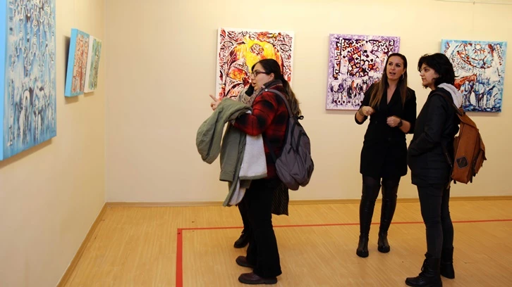 Pınar Kanber’in tuval üzerine akrilik boya tekniğiyle yaptığı resimlerinden oluşan “Kervansarayların İzinde” temalı resim sergisinde 31 eser yer alıyor.