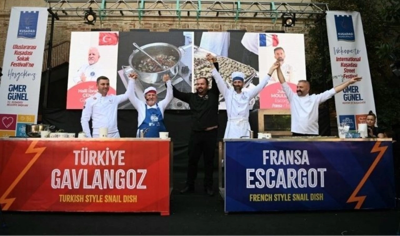 Kuşadası Belediyesi ile Kuşadası Altın Güvercin Kültür Sanat ve Tanıtım Vakfı (KUSAV) iş birliğinde, Ayhan Sicimoğlu’nun katkılarıyla düzenlenen Uluslararası Kuşadası Sokak Festivali ile bu yıl üçüncü kez “Hayat Sokakta” diyen Türkiye’nin turizm başkenti, ‘Salyangoz Düellosu’na ev sahipliği yaptı. Tarihi Kervansaray’da gerçekleşen düello, Türk şef Halil İbrahim Çengel ile Fransız şef Julien Moulieres arasında gerçekleşti. Soğan, sarımsak, biber ve domates kullanılarak tencerede zeytinyağı ile yahni şeklinde pişirilen Türk usülü “galyangoz” ile bol sarımsak ve maydanozlu sosla tereyağlı olarak fırında pişirilen Fransız usülü “escargot”un yarıştığı düellonun sonucunu Kervansaray’ı dolduran katılımcılar belirledi. Türk şef Halil İbrahim Çengel ile Fransız şef Julien Moulieres tarafından hazırlanarak bizzat servis edilen Türk ve Fransız usülü salyangozların tadına bakan festival katılımcıları karar vermekte zorlandı. Galyangoz ile escargortun birbirinden lezzetli olduğunu ifade eden katılımcılar hem Türk hem de Fransız şefi galip ilan etti. Böylece kazanan dostluk ve lezzet oldu.
