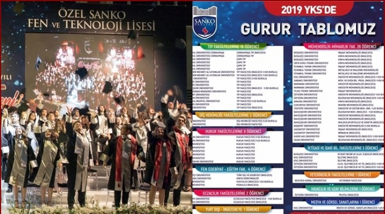 SANKO Liseleri 2019 mezunu öğrencilerden 18’i tıp, 25’i mühendislik, 8’i hukuk, 3’ü fen-edebiyat, 2’şeri diş hekimliği, eczacılık, uluslararası işletmecilik ve ticaret, 1’eri mimarlık, eğitim, siyaset bilimi ve uluslararası ilişkiler, veterinerlik, havacılık ve uzay bilimleri ile medya ve görsel sanatlar, 1’i de yurt dışı (İngiltere) tasarım fakültelerini kazanarak büyük bir başarıya imza attı.