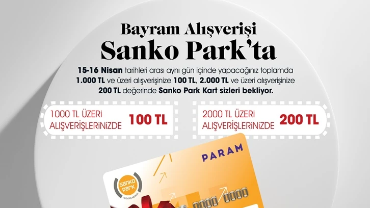 Yarın (15 Nisan Cumartesi) başlayacak kampanya, 16 Nisan Pazar günü sona erecek. Kampanya kapsamında ziyaretçiler, Sanko Park Alışveriş Merkezi’ndeki mağazalardan aynı gün içerisinde yapılacak toplamda bin TL ve üzeri alışverişlerde 100 TL, iki bin TL ve üzeri alışverişlerde 200 TL değerinde Sanko Park Kart kazanacak.