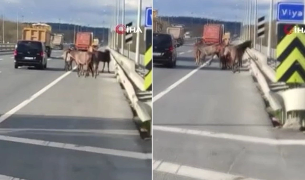 Başıboş atlar otoyolda trafiği birbirine kattı. Otoyolda koşan atlardan birine ticari araç çarptı.