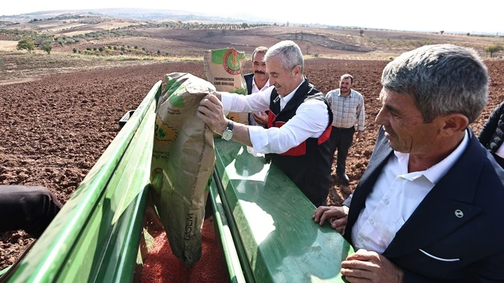 Şahinbey Belediye Başkanı Mehmet Tahmazoğlu, çiftçilerin desteklenmesi için dağıttığı buğday tohumunu ve gübreyi çiftçilerle birlikte toprakla buluşturdu.