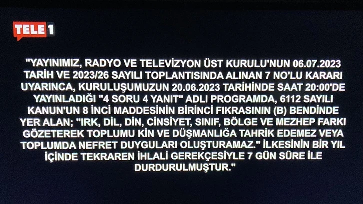 Gerçekleri savunduğu, cesur yayıncılık yaptığı için siyasi iktidarın hedef aldığı Tele1 Televizyonu’na iktidarın sopası haline gelen RTÜK tarafından basın tarihine kara bir leke olarak geçecek 7 günlük ekran karartması cezası verildi.