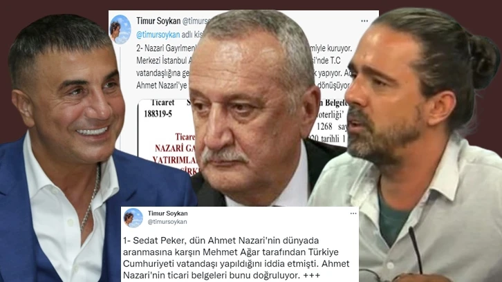 Suç örgütü lideri Sedat Peker sosyal medya paylaşımlarında, Mehmet Ağar'ın İran vatandaşı Ahmet Nazari’yi Türkiye’de sakladığını, sonra da vatandaşlık verdirdiğini iddia etmesinin ardından gazeteci Timur Soykan, Twitter’da yaptığı paylaşımda Peker’in iddialarının Nazari’ye ait ticari belgelerle doğrulandığını açıkladı.