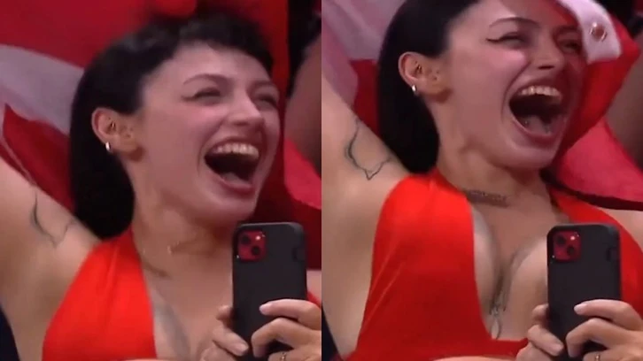 TRT Spor'da yayınlanan maç sonrası sevinan taraftarlar da ekrana geldi. O sırada Milli Takımı destekleyen bir kadın kıyafetinin azizliğine uğradı. Zıplayan kadının canlı yayında memesi açıldı.