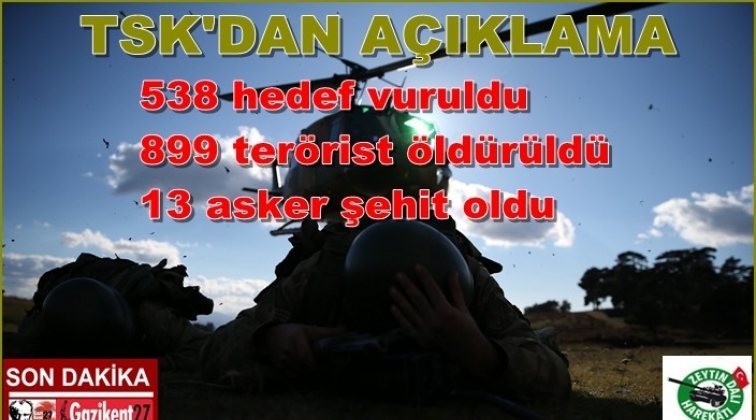 TSK Afrin'de süren Zeytin Dalı Harekatı'na ilişkin 26 Ocak – 03 Şubat tarihlerine ilişkin bilgileri paylaştı. Yapılan son dakika açıklamasına göre harekâtın başlangıcından itibaren Hava Kuvvetleri'ne ait uçaklar PKK/KCK/PYD-YPG ve DEAŞ terör örgütüne ait 538 hedef imha etti, en az 899 terör örgütü mensupları etkisiz hale getirildi. Yine harekat kapsamında 13 asker şehit oldu, 57 asker de yaralandı.