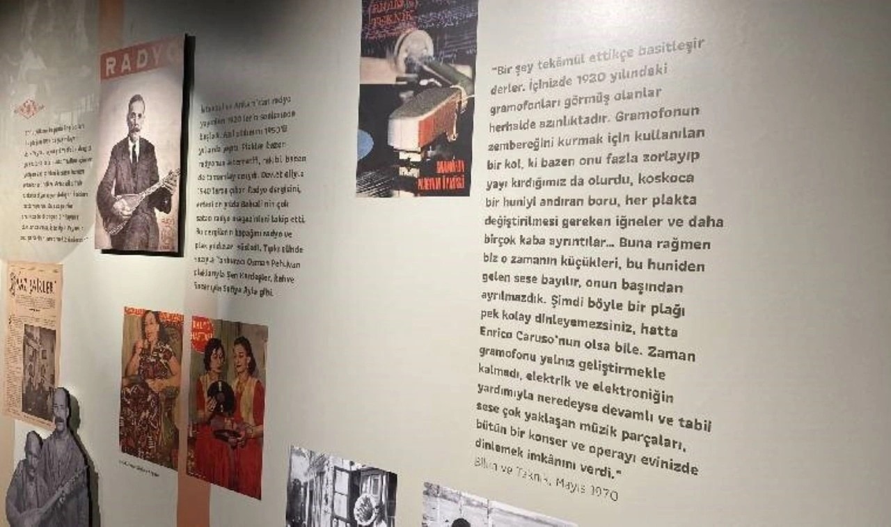 1923’ten başlayarak günümüze kadar uzanan müzik dergileri, gazetelerin müzik sayfaları, plaklar, kasetler, CD’ler, ve dönemle ilişkibihi her döneme damgasını vuran müzik çalarlar, albüm kapakları, müzisyenlerin oynadıkları filmlerin afişleri, içi kasetlerle dolu bir el arabası, özel bir nostalji köşesi... Sergide yok yok. Fikret Kızılok’un, 1969’da kendi parasıyla aldığı ilk gitar da sergileniyor; Musa Eroğlu, Muhlis Akarsu ve Yavuz Top’un sazla, sözle hemhal olduğu “Muhabbet 6” albümleriyle Tarkan’ın albümleri ve kart-postalları aynı camekân-da sergi-leniyor. Hem Zeki Müren hem Yahya Kemal hem de Ayna grubunun izine rastlayabiliyorsunuz. Kısacası her kuşağın kendi dönemine ait bir nostaljisi bu sergide yaşıyor.