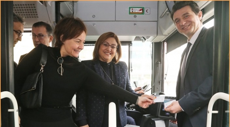 Konuşmaların ardından Gaziantep Büyükşehir Belediye Başkanı Fatma Başkan Şahin, otobüste temassız kredi kart sistemini kullandı.