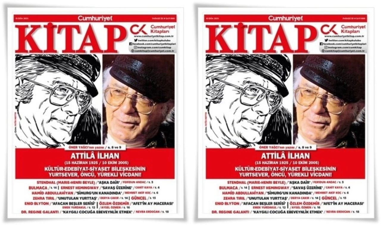 - “…Belki harbi etiyle kemiğiyle yaşamamış; ama gazete, radyo ve sinema yoluyla bir yandan; fırında kaybolan ekmek, seferber edilmiş ordu, pasif korunma ve karartmalar yoluyla öbür yandan; onun sertliğini ve hainliğini ‘etinde duymuş’ bir harp delikanlısının şiirleri…” diyerek 1948’de Duvar’la başlattığı şairliğini ömrü boyunca sürdürdü.“Yüreğiniz rahat olsun dövüşenler var/ yarım kalan şarkınıza onlar devam edecek…” dizeleriyle faşizme, savaşa meydan okuyan bir delikanlı, Nâzım Hikmet’e “Duvar beni çok sevindirdi. Gayet soylu, özlü şair. Pek beğendim. Aşkolsun delikanlıya!” dedirten bir şair oldu.Sisler Bulvarı’ndaki “Pia”, “Emperyal Oteli” gibi klasikleşen şiirleriyle dikkat çekti. Şiirle aşkı, siyaseti, özgürlüğü bütünleştirerek kültleşen şirini yarattı.Mustafa Kemal hareketinin antiemperyalist nitelikleri açıkça belli olan bir ulusal demokratik devrim olduğu, Osmanlı ümmet toplumundan Türk ulus toplumuna geçişi öngören bir süreci başlattığı bilinciyle bir Türk yazarının yapıtlarını, temelleri Kurtuluş Savaşı’na uzanan, içinde imparatorluk toplumundan gelen insanların da yaşadığı bir gelişme süreci içinde tasarlaması gerektiğini düşündü.Kurtlar Sofrası’nda Kurtuluş Savaşı’nı gerçekleştiren kuşağı, “Kuvayı Milliye ruhu”nu arayan boyutuyla işledi. Ekim 1967’de Yön’de başlattığı ve bir dizide kitaplaştırdığı yazılarıyla şair, romancı kimliğine kültür savaşçılığını ekledi. Cumhuriyet’te yazdığı köşe yazılarını “Cumhuriyet Söyleşileri” kitaplarıyla sürdürdü.Kurtuluş Savaşı’ndan günümüze, bağımsızlıkla, Kemalizm-sosyalizm ilişkisi üzerine düşüncelerinin yer aldığı “...bir sap kırmızı karanfil...” yurtseverlere sunulmuş gerçek bir karanfildi. Sosyalizmin kendini bulabilmesi için Kemalizmle arasındaki bağları koparması gerektiğini söyleyen kimi sol düşünüşlerin karşısında “Kemalizmin sosyalizme aykırı olmadığı”nı söyledi.Aydınlığına özlemle, saygıyla Attilâ İlhan (15 Haziran 1925 / 10 Ekim 2005) kapağımızda. Öner Yağcı’nın yazısı...- Üçüncü sayfamızda, “Bir aşk kırgını: Stendhal!” başlıklı yazısında Stendhal’in Aşka Dair (Çeviren: Ayberk Erkay / Yapı Kredi Yayınları) adlı yapıtını irdelediği Feridun Andaç yer alıyor.- Cahit Kaya, dilimize çevirdiği, Ernest Hemingway’in torunu Seán Hemingway’in derlediği Savaş Üzerine’yi (Bilgi Yayınevi) inceliyor.- Mehmet Akif Koç, dilimize çevirdiği, edebiyat tarihçisi, öykü ve roman yazarı Hamid Abdullahiyan’ın İran’daki üniversitelerde referans kitap olarak da okutulan Simurg’un Kanadında’sını (Livera Yayınevi) merceğe alıyor.- Derya Çakır, Zehra Tırıl’ın yeni öykü kitabı Unutulan Yurttaş’ı (Yapı Kredi Yayınları) değerlendiriyor.- Aysel Özmen, Özlem Özdemir’in Benim Adım Afet ile başlayan, gençlere Cumhuriyet değerlerini anlattığı serisinin ikinci halkası Afet’in Ay Macerası’nı (Kırmızı Kedi Yayınevi) konuşuyor.- Nevra Erdoğan, çocuk ve ergenlerde kaygı konusunda uzman Dr. Regine Galanti’nin Kaygılı Çocuğa Ebeveynlik Etmek (Çeviren: Zeynep Sağanak / Timaş Yayınları) adlı kitabını inceliyor.- Emek Yurdakul, Enid Blyton’ın Afacan Beşler Define Adasında, Afacan Beşler Macera Peşinde, Afacan Beşler Adaya Dönüş (Çeviren: Deniz Koç / Redhousekidz) adlı kitaplarını değerlendiriyor.- Kısa tanıtımlar, Emek Yurdakul’un hazırladığı Güncel ve Mustafa Başaran’ın hazırladığı Bulmaca ile de düşün trafiği sürüyor!İyi okumalar…Gamze AkdemirKitap Dergi, 1808. sayısıyla YARIN gazeteniz Cumhuriyet’le birlikte…Unutmayın; her gün Cumhuriyet, her Perşembe Cumhuriyet Kitap okunur!