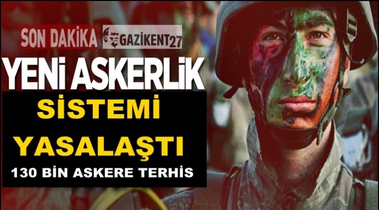 Yeni askerlik sistemini düzenleyen Askeralma Kanunu Teklifi, TBMM Genel Kurulu'nda kabul edilerek yasalaştı. Yasa, Cumhurbaşkanı Recep Tayyip Erdoğan'ın onaylayıp Resmi Gazete'de yayınlanmasıyla yürürlüğe girecek.