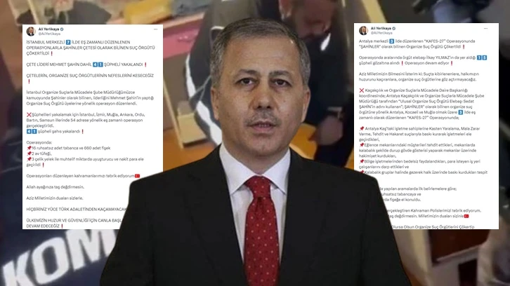 İçişleri Bakanı Ali Yerlikaya, Antalya merkezli 3 ilde düzenlenen 'Kafes-27 Operasyonu'nda "Şahinler" organize suç örgütünün çökertildiğini, örgüt elebaşının da aralarında bulunduğu 15 şüphelinin gözaltına alındığını açıkladı. Yerlikaya'nın eylül ayında da "Şahinler örgütü çökertildi" diye paylaşım yaptığı dikkat çekti.