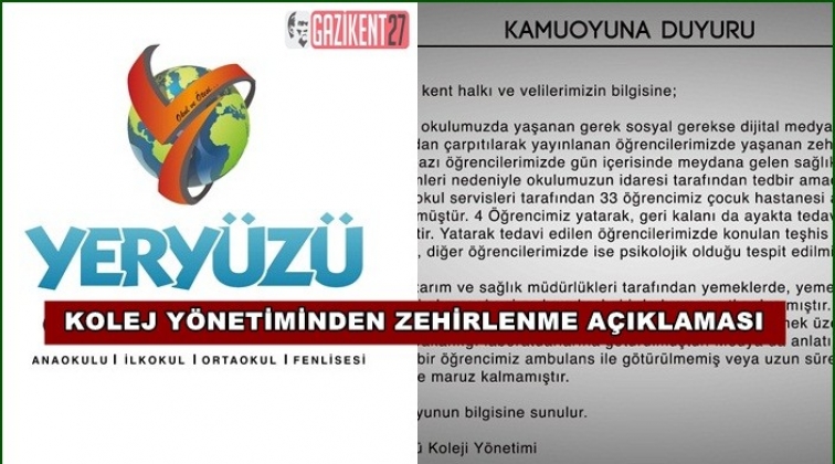 Gaziantep'te dün Yeryüzü Koleji'nde okuyan 33 öğrencinin, yüksek ateş, mide bulantısı ve kusma gibi şikayetler nedeniyle hastanelere kaldırılmasıyla ilgili okul yönetiminden açıklama yapıldı.