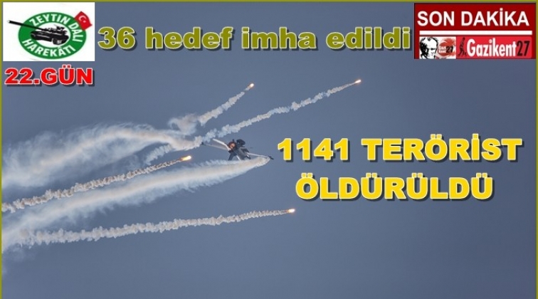 Zeytin Dalı Harekatı'nın 22. gününde, 79 terörist etkisiz hale getirildi. Harekatın başından itibaren etkisiz hale getirilen terörist sayısı 1141’e yükseldi.