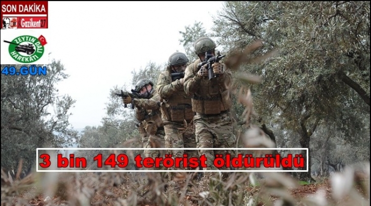 Türk Silahlı Kuvvetleri (TSK) Afrin'de yürütülen Zeytin Dalı Harekâtı'nın 49. gününde etkisiz hale getirilen terörist sayısının 3 bin 149 olduğunu açıkladı.