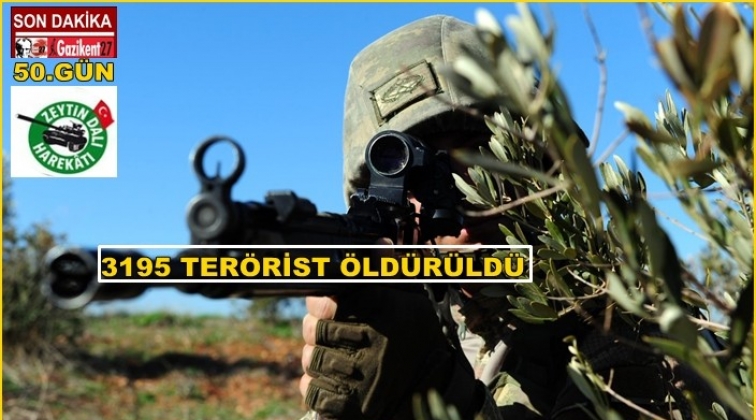 Türk Silahlı Kuvvetleri (TSK) Afrin'de yürütülen Zeytin Dalı Harekâtı'nın 50. gününde etkisiz hale getirilen terörist sayısının 3 bin 195 olduğunu açıkladı.